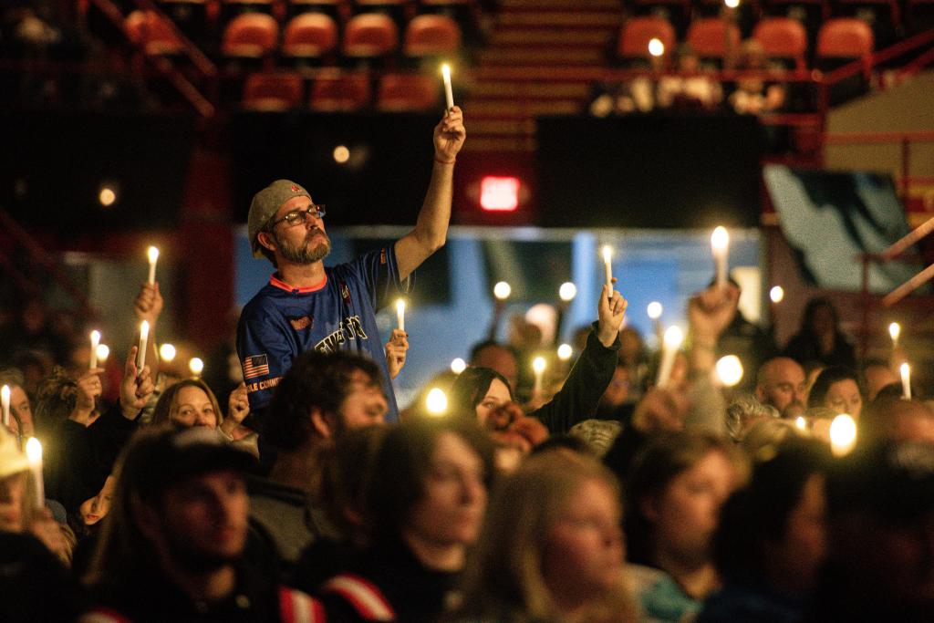 2024年10月25日,人们在美国缅因州刘易斯顿市手举蜡烛悼念2023年大规模枪击案遇难者。新华社发(朱子于摄)