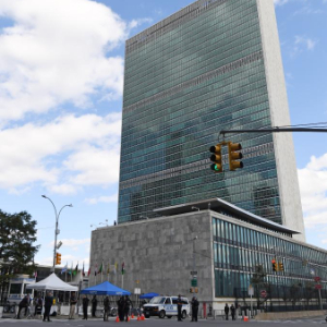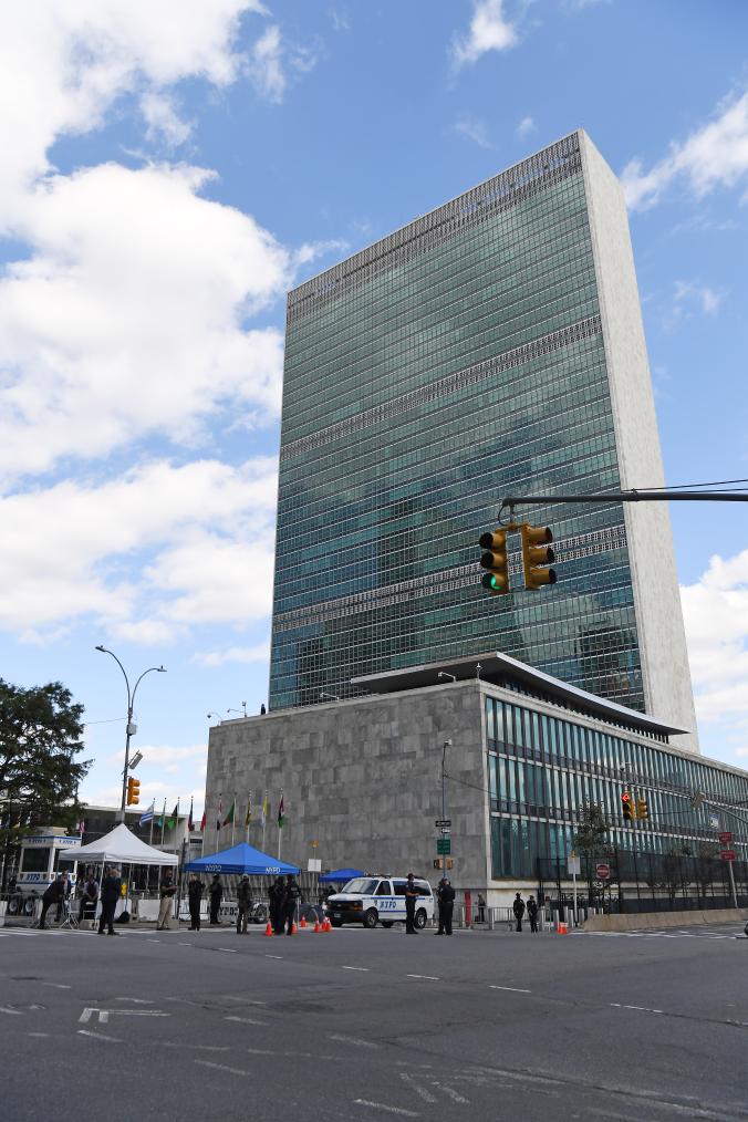 2023年9月19日,在美国纽约,警察在联合国总部附近街头警戒。新华社记者李睿摄