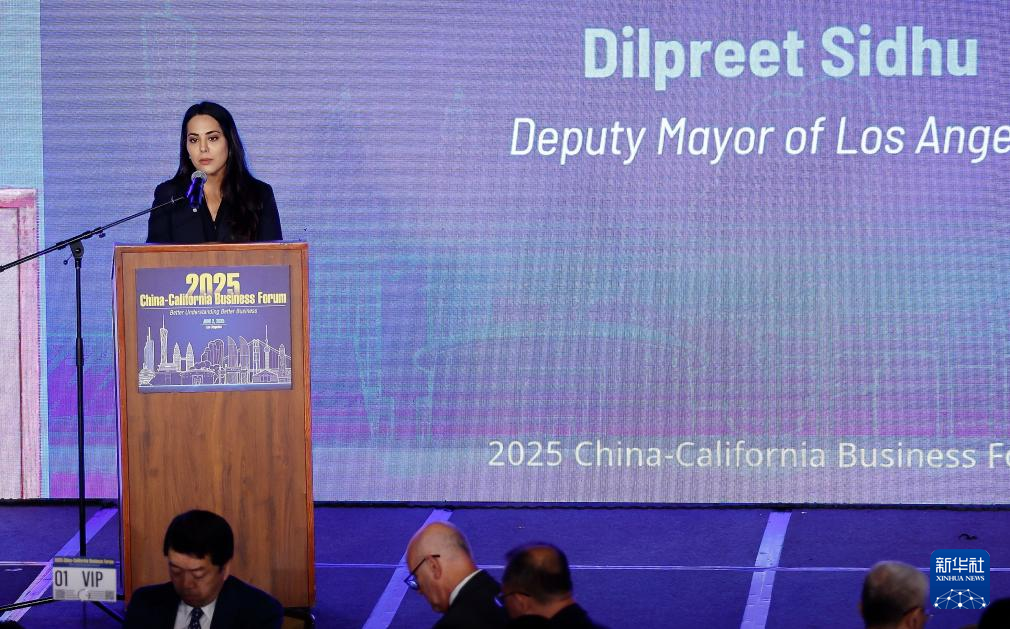 6月2日,美国洛杉矶市副市长迪尔普里特·西杜在洛杉矶举行的2025年中国—加州经贸论坛上发表主旨演讲。新华社发(邱晨摄)