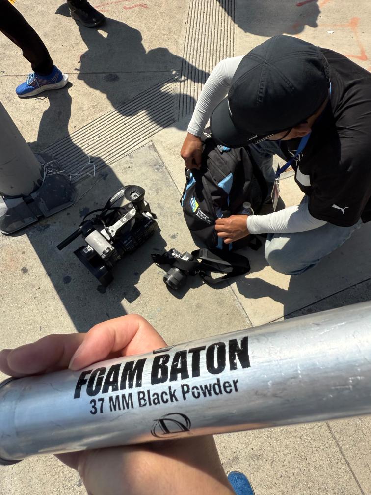 这是6月8日在美国加利福尼亚州洛杉矶市中心的联邦执法机构门前拍摄的警方发射的泡沫弹外壳。新华社记者高山摄