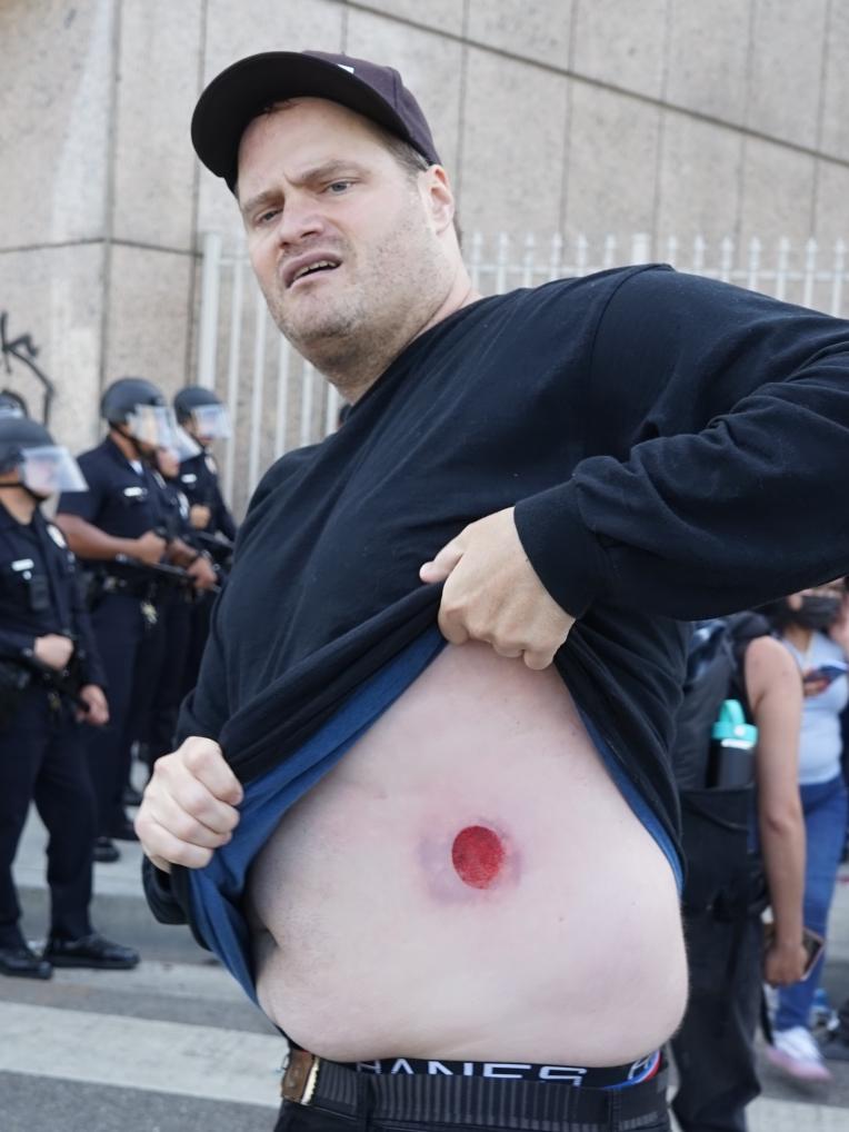 6月8日,在美国加利福尼亚州洛杉矶市中心,一名抗议者展示遭警方枪械击中后留下的伤痕。新华社发(邱晨摄)