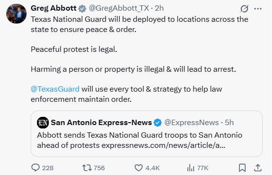 “和平抗议是合法行为,但伤害他人和损坏财产不合法,(肇事者)会被逮捕。”共和党籍的阿博特在社交媒体上说,“得州国民警卫队将用一切方式方法,帮助执法机构维持秩序。”