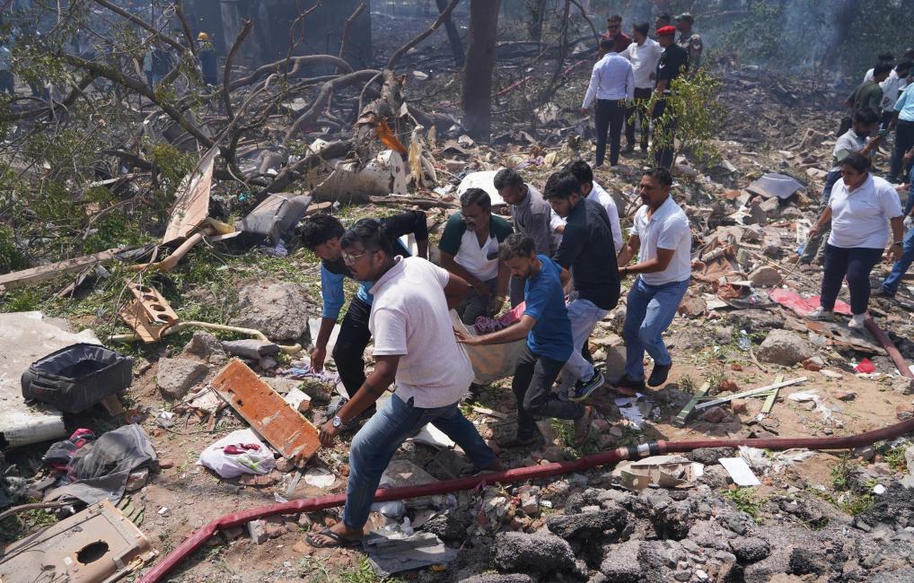 6月12日,在印度古吉拉特邦艾哈迈达巴德,人们在客机失事现场运送遇难者遗体。新华社发