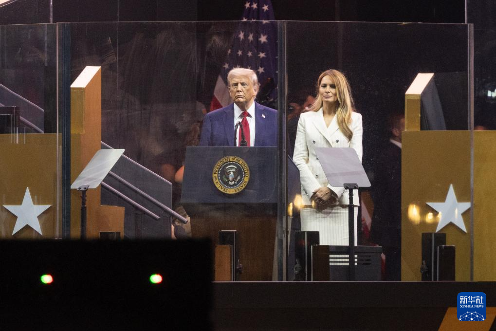 6月14日,在美国首都华盛顿,美国总统特朗普和夫人梅拉尼娅出席阅兵式。 新华社记者 胡友松 摄