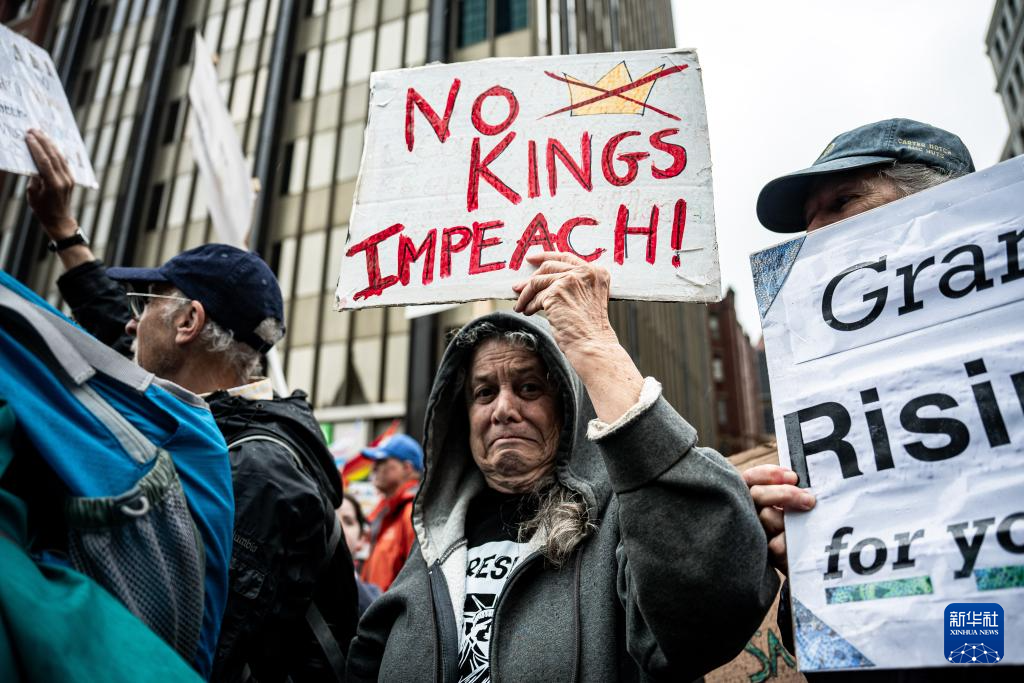 6月14日,在美国马萨诸塞州波士顿,人们参加 “不要国王”抗议活动。 新华社发 (朱子于摄)