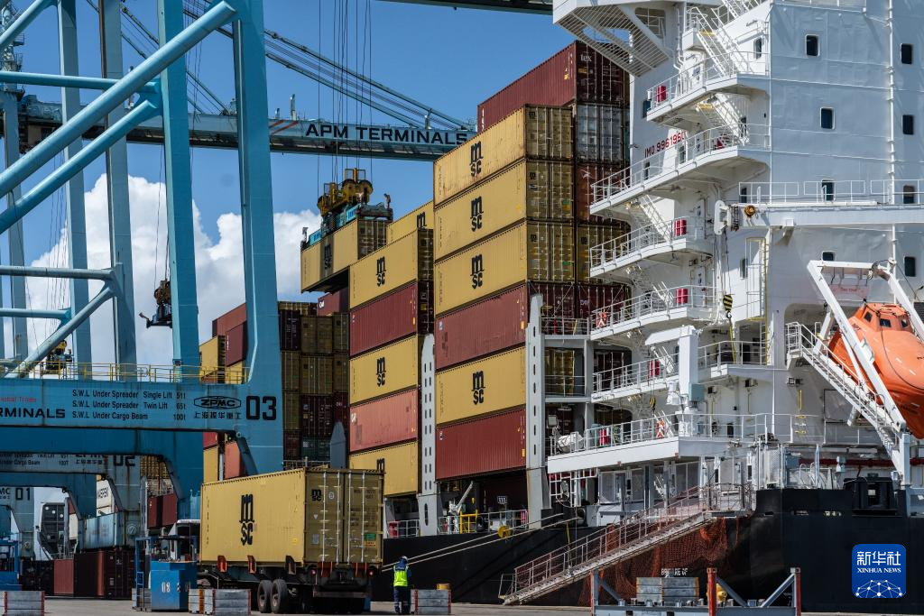 5月8日,在巴西塞阿拉州佩森港的集装箱码头,一艘集装箱货轮进行装卸作业。新华社记者 王天聪 摄