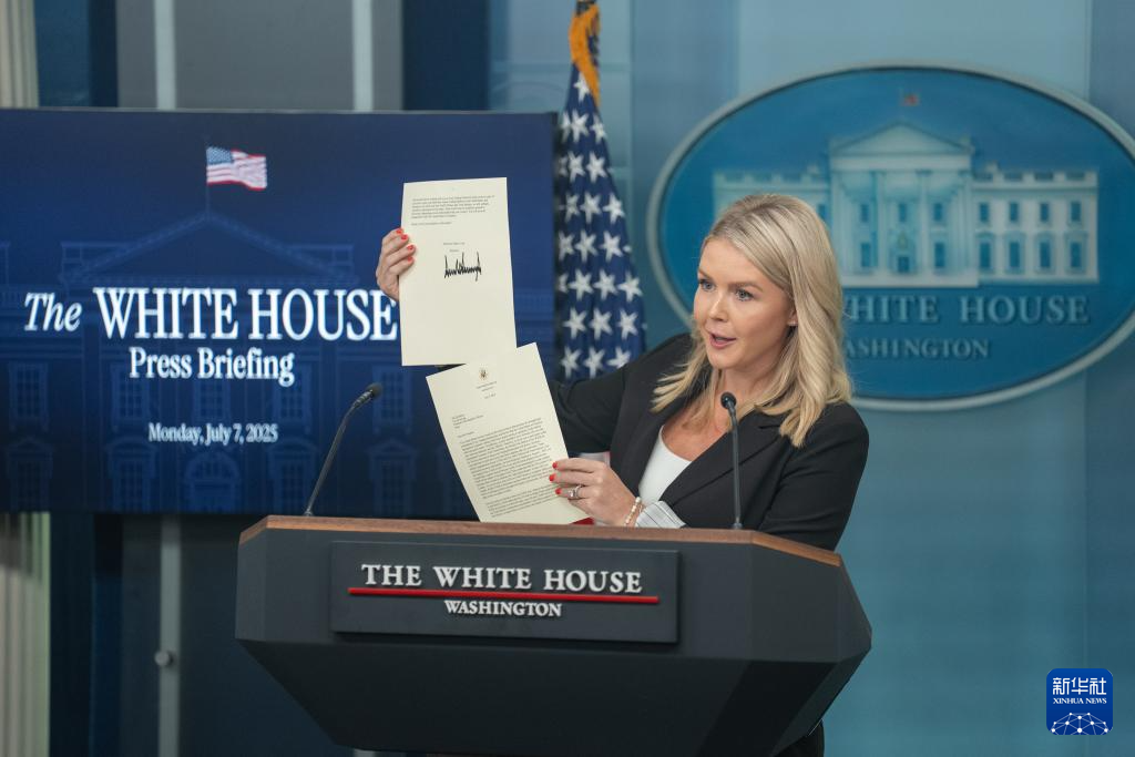 7月7日,在美国首都华盛顿白宫,白宫新闻发言人卡罗琳·莱维特在记者会上展示美国总统特朗普致韩国总统的信函。新华社记者 胡友松 摄