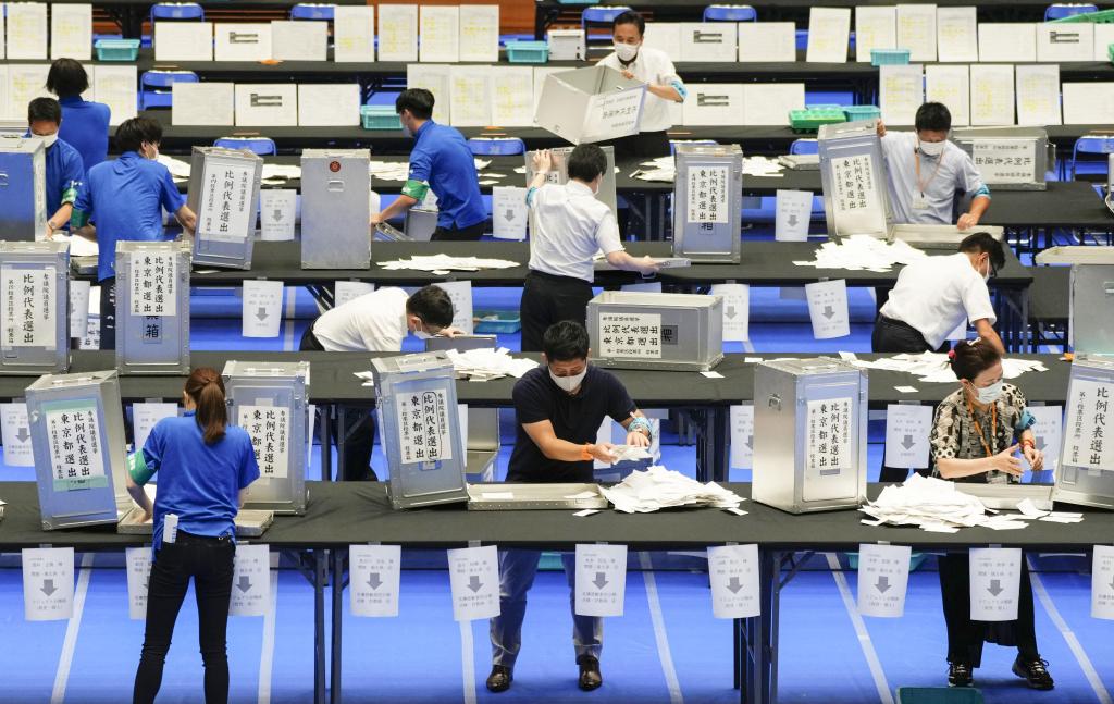 图为2022年7月10日在日本东京港区体育中心拍摄的上届参议院选举开票作业现场。新华社/共同社