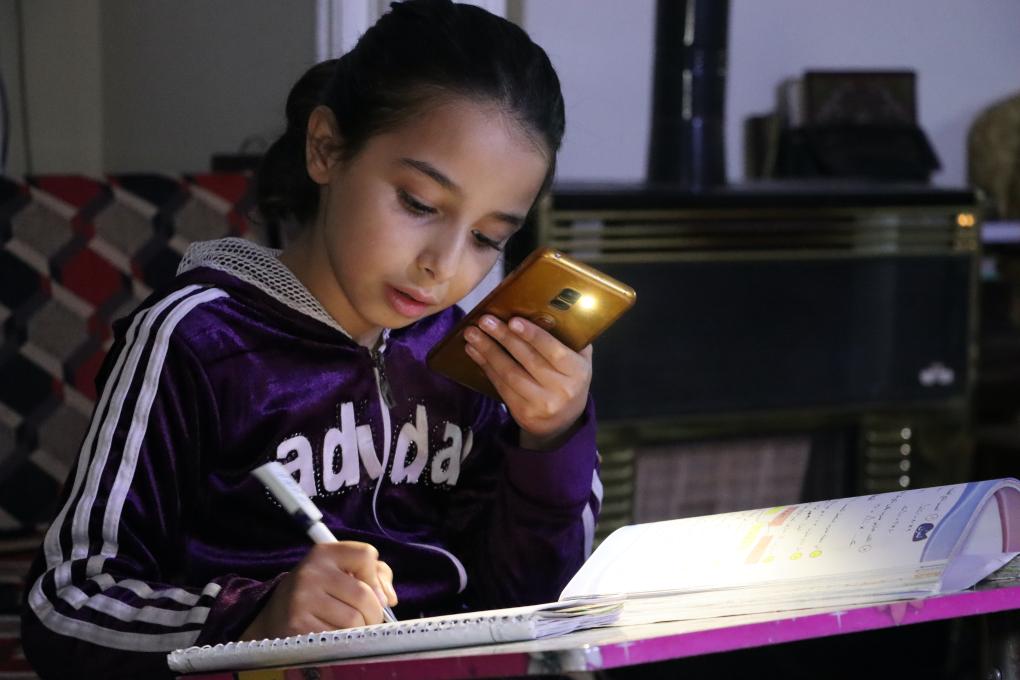 2023年12月28日,在叙利亚东北部的哈塞克,11岁的学生努尔·哈穆德在家中学习。因为房间光线昏暗,她使用手机照明。新华社发