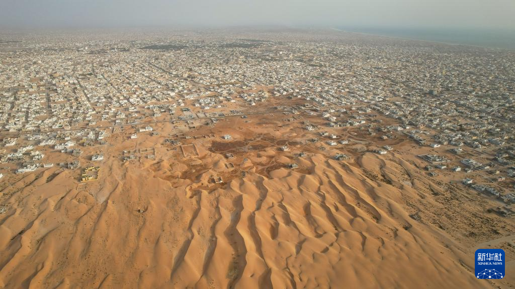 这是6月17日在毛里塔尼亚首都努瓦克肖特拍摄的沙丘和城市景观(无人机照片)。