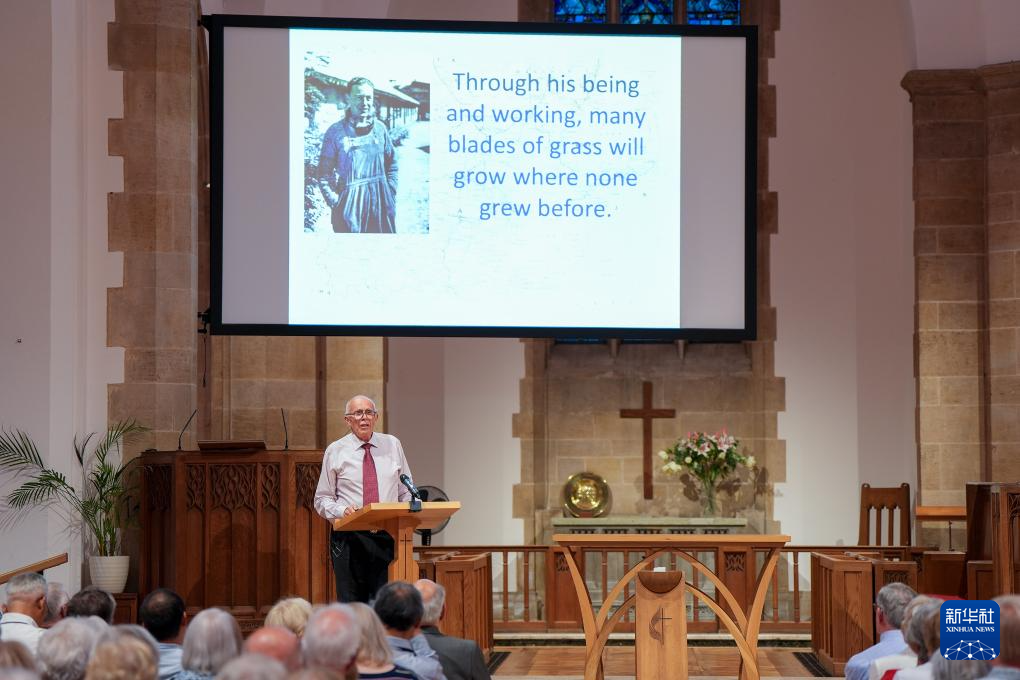 7月22日,在英国赫特福德郡哈彭登镇,乔治·何克的外甥马克·艾尔温·托马斯在纪念活动上发表演讲。新华社记者 吴鲁 摄