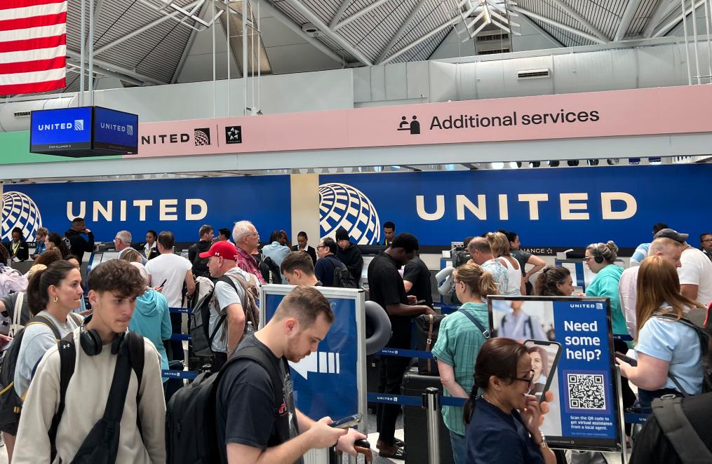 2024年7月19日,乘客在美国芝加哥国际机场等待航班信息。新华社记者颜亮摄
