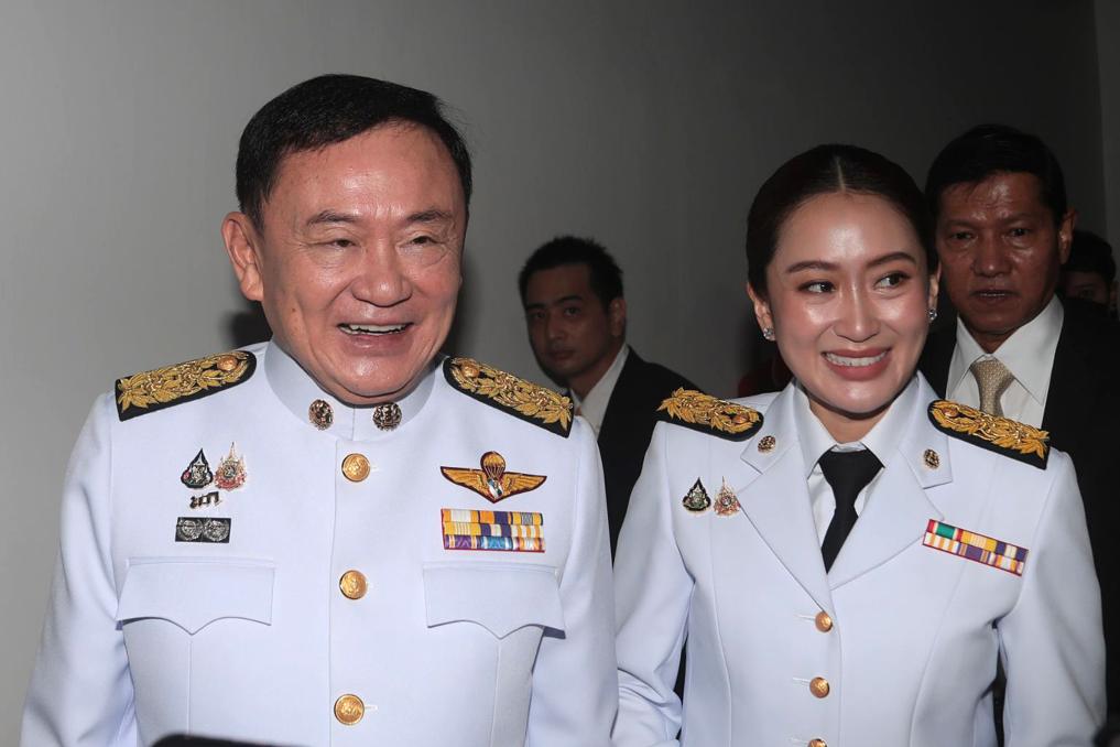 2024年8月18日,佩通坦·钦那瓦(右)与其父亲、泰国前总理他信(左)抵达位于曼谷的为泰党总部。新华社发(拉亨摄)