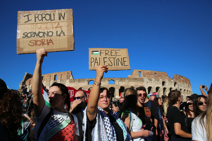 2025年10月4日,在意大利罗马,声援巴勒斯坦的游行队伍向斗兽场行进,要求以色列立即停止对加沙地带的军事行动,释放“全球坚韧船队”人员。新华社记者 李京 摄