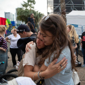10月9日,在以色列特拉维夫,人们获悉加沙停火协议的消息后相互庆祝,期待被扣押的人员早日获释。新华社记者陈君清摄