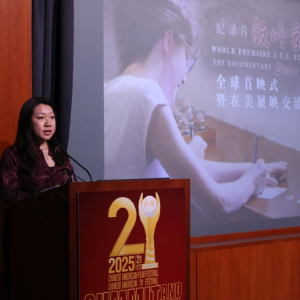 11月7日,中美合拍纪录片《鼓岭家书》制片人张玥涵在该片洛杉矶展映交流活动上致辞。新华社发(邱晨摄)