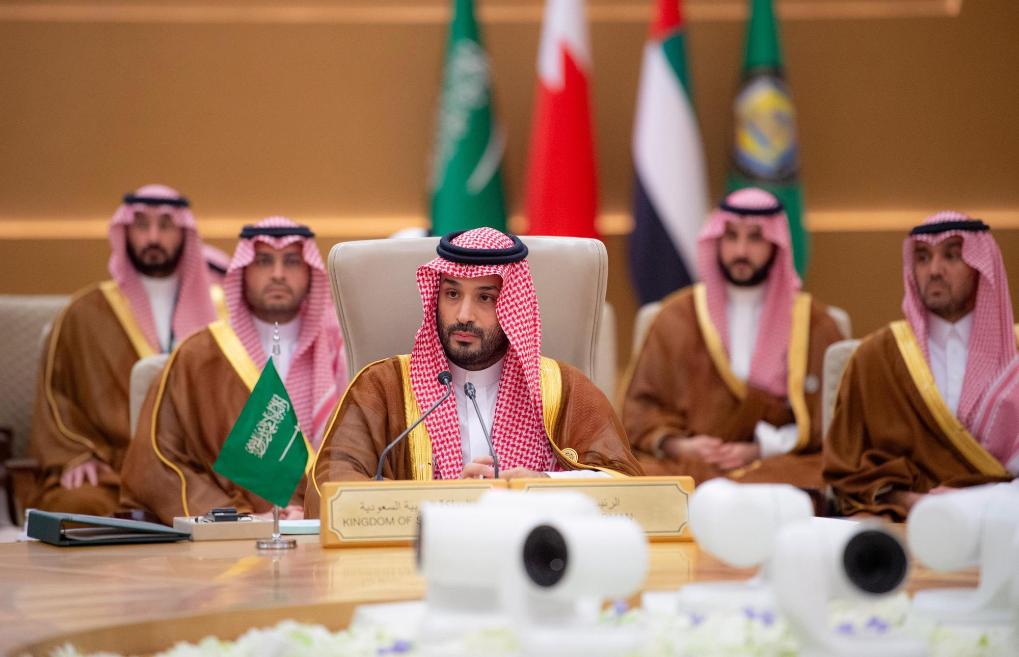 5月14日,在沙特阿拉伯利雅得,沙特王储兼首相穆罕默德(前)在海合会-美国峰会上讲话。新华社发(沙特通讯社供图)