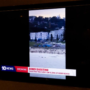 这是12月14日在澳大利亚悉尼拍摄的报道邦迪滩枪击事件的电视画面。新华社记者 马平 摄