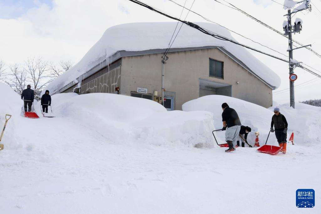 2月2日,人们在日本青森市清理积雪。新华社/共同社