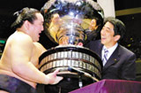 安倍给秋季相扑比赛获胜者颁发奖杯