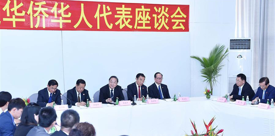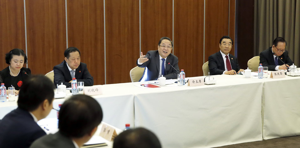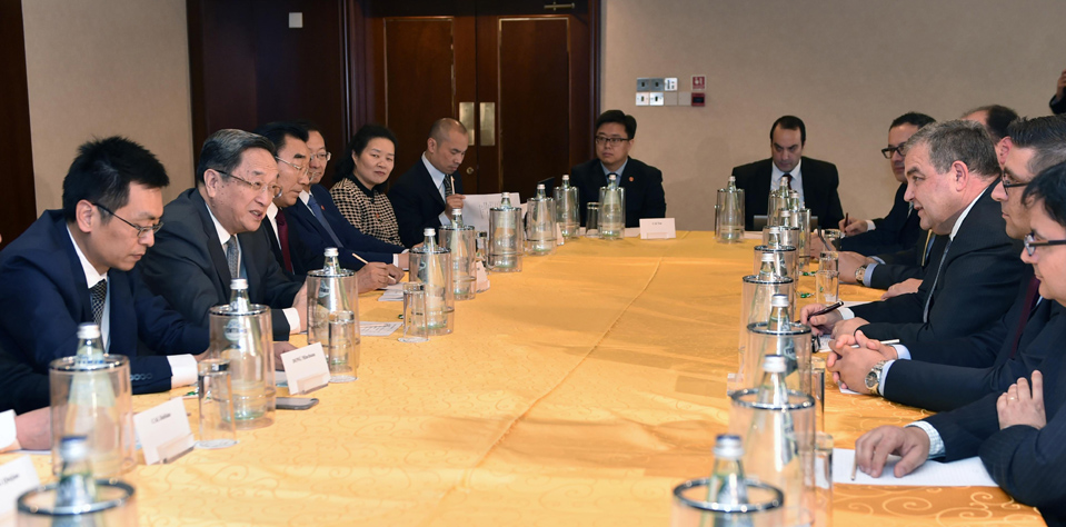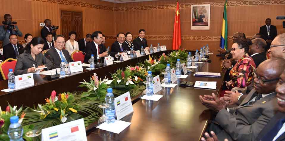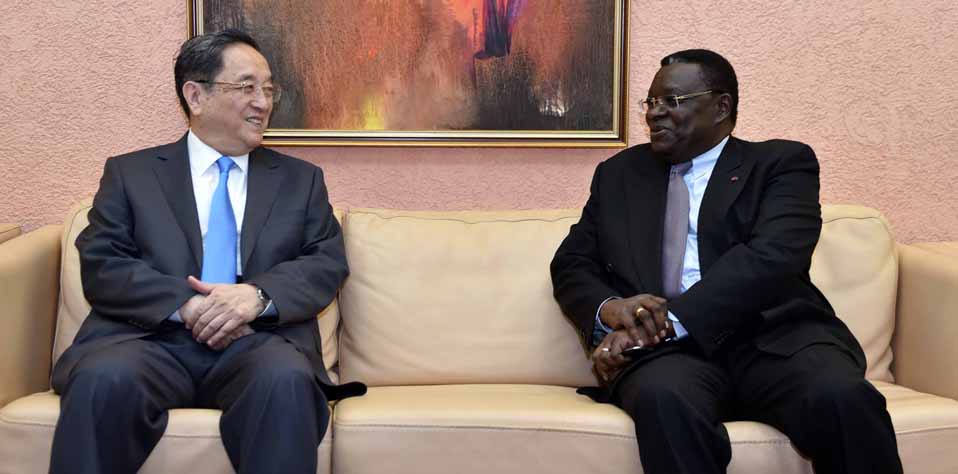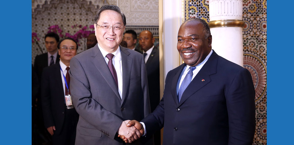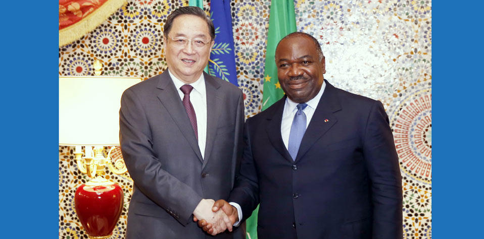正在加蓬进行正式友好访问的全国政协主席俞正声11日在利伯维尔会见加蓬总统邦戈。