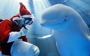 世界各地迎圣诞:“圣诞老人”给白鲸喂食