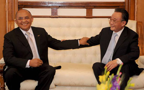 正在塞舌尔进行正式友好访问的中国全国人大常委会委员长吴邦国当地时间13日下午在下榻的饭店与塞舌尔国民议会议长赫米尼耶举行会谈。