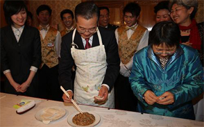 温家宝与华侨华人、留学生和使馆人员一起包饺子
