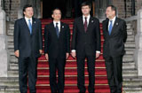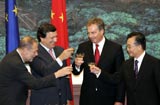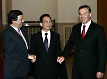 国务院总理温家宝5日在人民大会堂与英国首相布莱尔、欧盟委员会主席巴罗佐及欧盟理事会秘书长兼共同外交与安全政策高级代表索拉纳举行中欧第八次领导人会晤。
