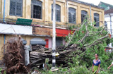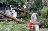 警察把被刮倒的树木搬走