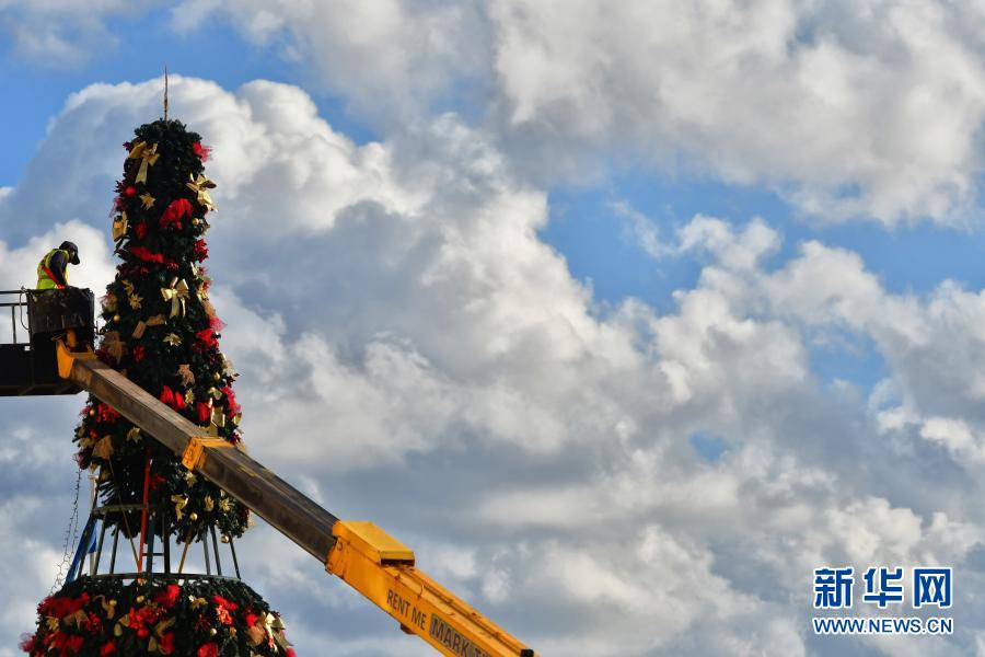 11月29日,一名工人在马耳他首都瓦莱塔装饰位于总理办公室前的一棵巨大圣诞树。