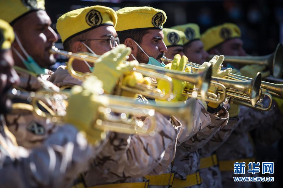 1月2日,在位于伊朗克尔曼的伊斯兰革命卫队下属“圣城旅”指挥官苏莱曼尼墓附近,士兵在苏莱曼尼遇难周年悼念活动上奏乐。
