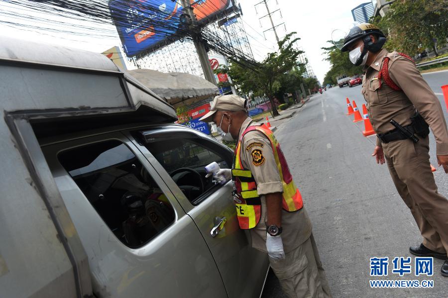1月5日,警察在泰国曼谷的一处防疫检查站测量过往车辆内人员的体温。