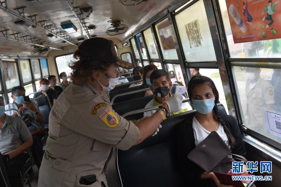 1月5日,警察在泰国曼谷的一处防疫检查站测量公交车内乘客的体温。