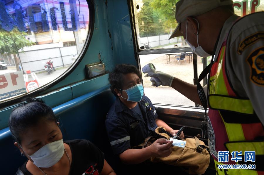 1月5日,警察在泰国曼谷的一处防疫检查站测量公交车内乘客的体温。