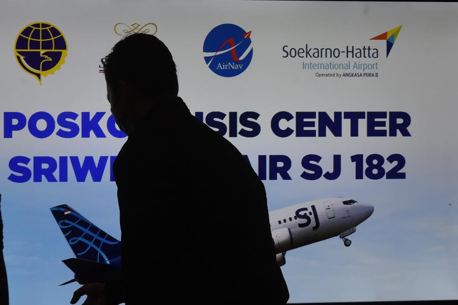 1月9日,在印度尼西亚首都雅加达苏加诺-哈达国际机场,工作人员经过一块写有“三佛齐航空公司客机坠毁事故应急中心”字样的显示屏。新华社发(阿贡摄)