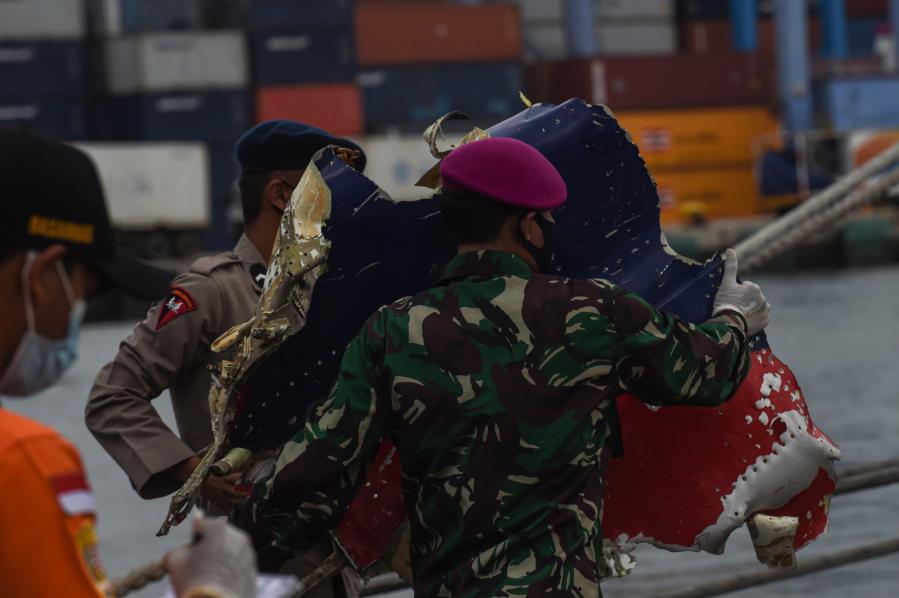 1月10日,搜救人员在印度尼西亚雅加达丹戎不碌港查看失事客机残骸。新华社发(阿贡摄)