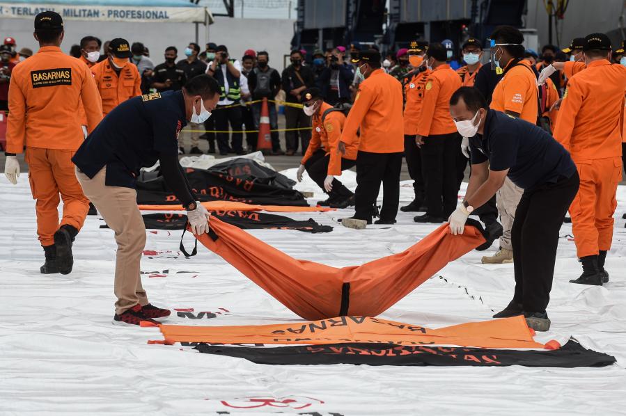 1月10日,搜救人员在印度尼西亚雅加达丹戎不碌港搬运打捞起的失事客机遇难者遗体。新华社发(阿贡摄)