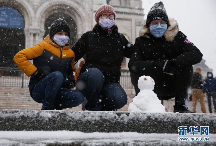 1月16日,人们在法国巴黎蒙马特高地圣心教堂前与小雪人合影。