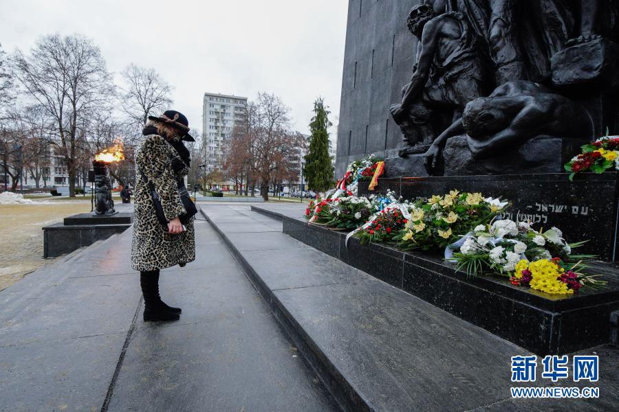1月27日,一名女子在波兰华沙的犹太人遇难者纪念碑前参加纪念活动。新华社发(亚普·阿林摄)