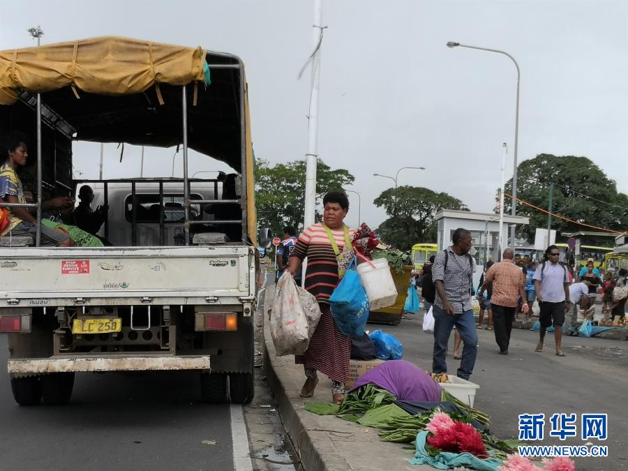 1月30日,一名女子(中)在斐济苏瓦的市场采购物资。