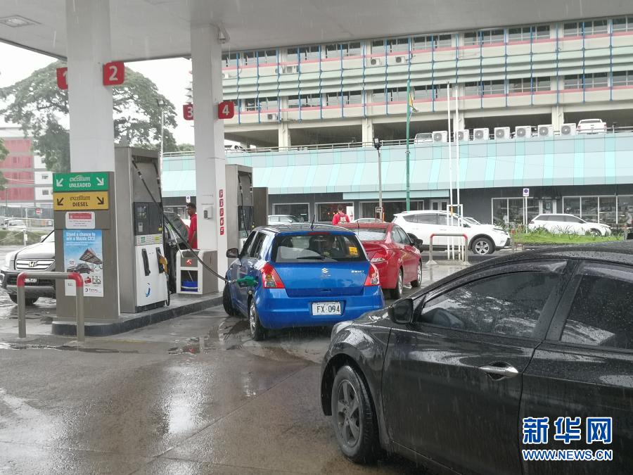 1月30日,人们在斐济苏瓦一个加油站排队为汽车加油。