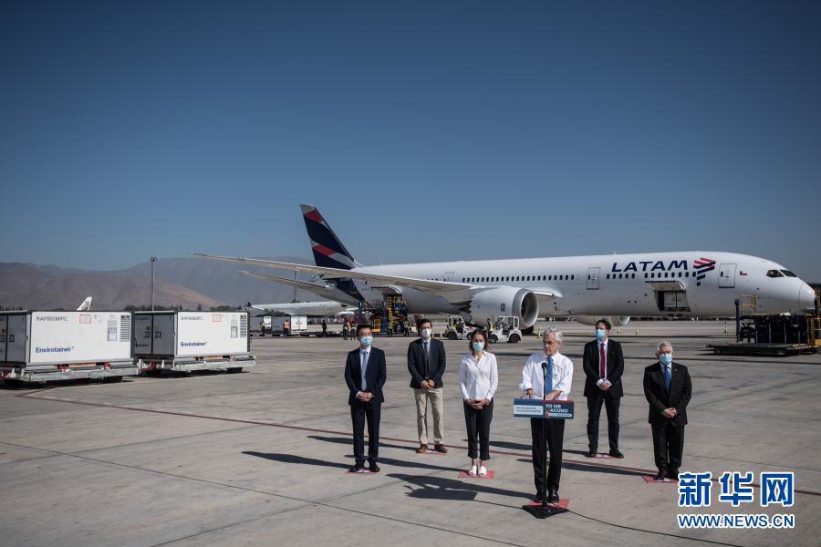 1月28日,在智利圣地亚哥国际机场,智利总统皮涅拉(右三)迎接首批中国新冠疫苗并发表讲话。