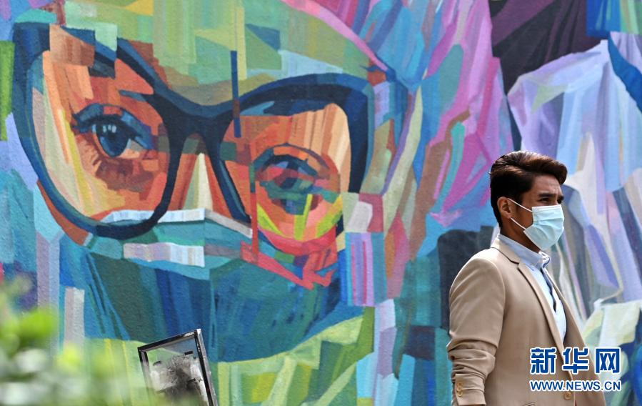 1月29日,戴口罩的行人走过马来西亚吉隆坡街头的一处医护人员题材的壁画。