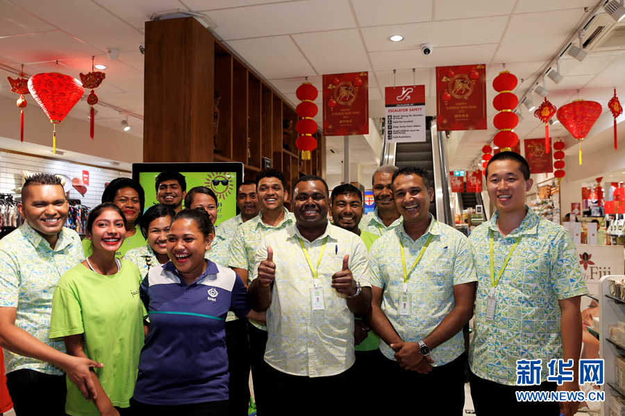 2月4日,斐济苏瓦,杰克之家经理(右二)与员工用汉语、英语及斐济语向中国人民祝福“新年快乐”。