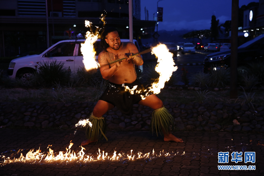 2月4日,斐济苏瓦,一名火舞表演者在杰克之家连锁店前进行惊险绝妙的表演。新华网发(张永兴 摄)