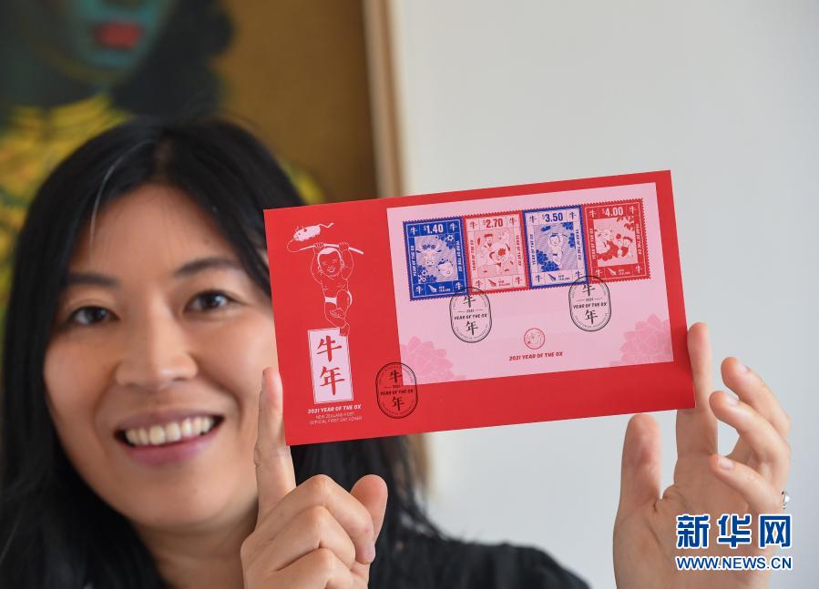 2月6日,在新西兰首都惠灵顿,华人设计师徐膺敏展示其设计的2021年中国牛年生肖邮票。