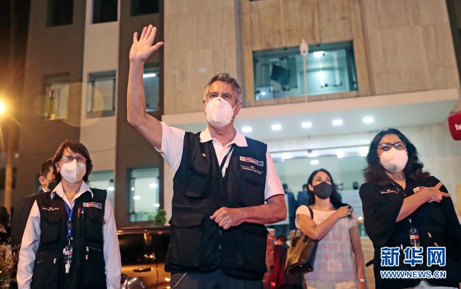 2月9日,在秘鲁首都利马陆军医院外,秘鲁总统萨加斯蒂接种新冠疫苗后向民众致意。新华社发(秘鲁总统府供图)