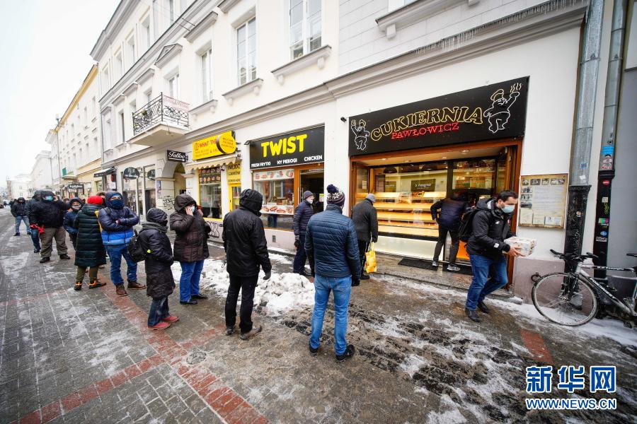 2月11日,顾客在波兰首都华沙的一处面包房外排队等待购买甜面包。