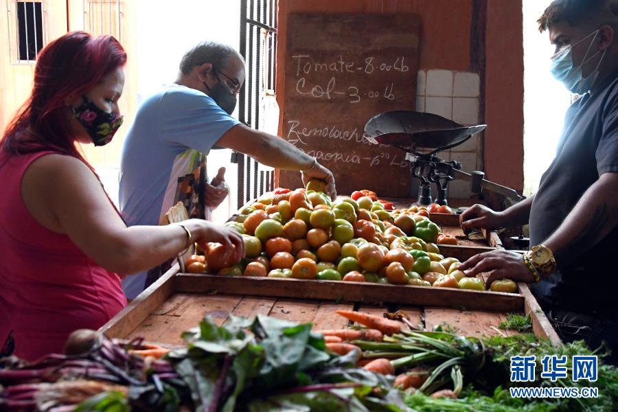 2月12日,人们在古巴哈瓦那老城区一家私营菜场买菜。
